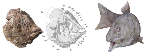 La bête qui fut la victime d’Ichthyovenator est connue par une tête isolée trouvée il y a quelques années dans un site proche de celui où fut trouvé le dinosaure. Elle est exposée dans une vitrine du musée de Savannakhet au Laos et nous l’avons donc décrite au mois de janvier. Il s’agit d’un lépisostéiforme au crâne bizarre, triangulaire, avec de tout petits yeux et une épaisse couverture osseuse (peut-être pour se protéger des spinosaures ?). Chose intéressante, des fragments isolés pouvant être attribué à ce genre ont été trouvés dans divers sites de Thaïlande dans une formation géologique contemporaine de celle du Laos. Ils ont été étudiés par Uthumporn Deesri, spécialiste des poissons fossiles de Thaïlande. Notre nouveau poisson occupant aujourd’hui les deux rives du Mékong (qui n’existait pas comme on l’a vu), il fallut donc lui trouver un nom qui reflète cette caractéristique transnationale.